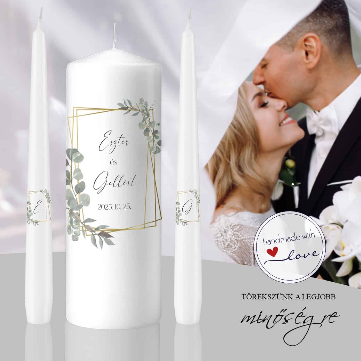 Az Eukaliptusz elegancia esküvői gyertya szett a modern letisztultság és a romantikus hangulat tökéletes ötvözete. 🌿 Az arany geometriai keret elegáns formát ad, míg az eukaliptusz motívum a tisztaságot, a harmóniát és az örökké tartó szerelmet szimbolizálja. A gyertyák személyre szabhatók a pár nevével, dátummal és akár egyedi üzenettel is, így minden szertartás valóban egyedivé és meghitté válik. Ez a kézzel készült, minőségi esküvői gyertya szett nemcsak az esküvő fényét emeli, hanem örök emléket is őriz a Nagy Napról. A Regina Kreatív Gyertyastúdió minden gyertyáját gondos odafigyeléssel készíti, hogy a legszebb fényben ragyoghasson a szerelem jelképe.
